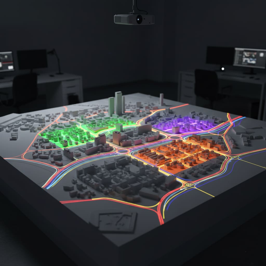 - Simulating Traffic Flow: Project animated lines of light moving along the model’s roads to show peak and off-peak traffic patterns.